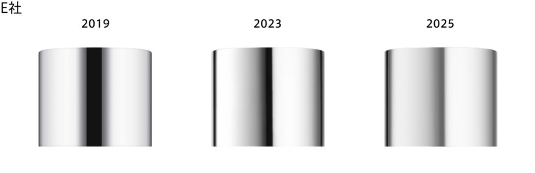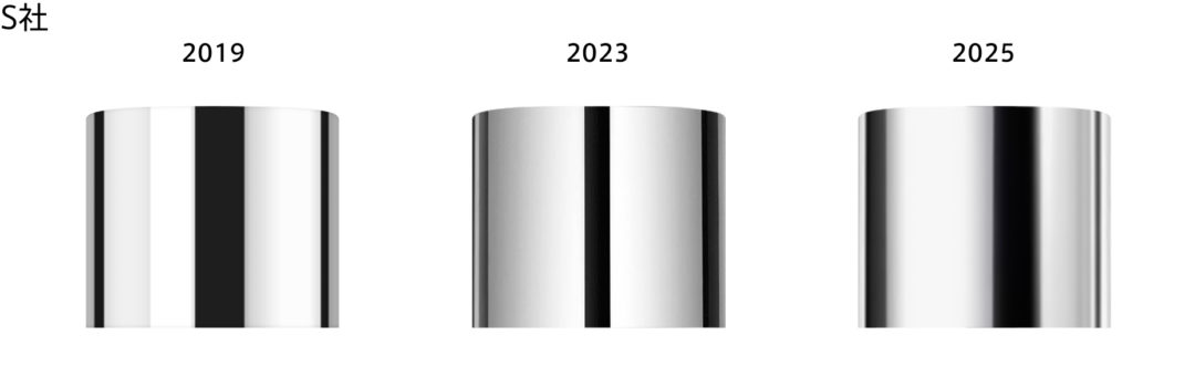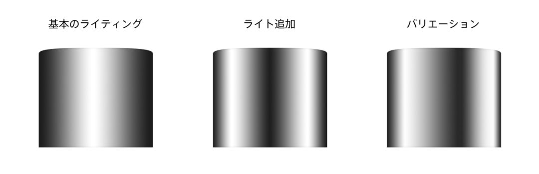 キャップは円柱形が一般的。白背景では輪郭が埋もれやすいため、シャドウでエッジを締めて立体感を出すのが基本です。さらにライトを追加し、反射による輝きを表現することでメタリックらしさが生まれます。